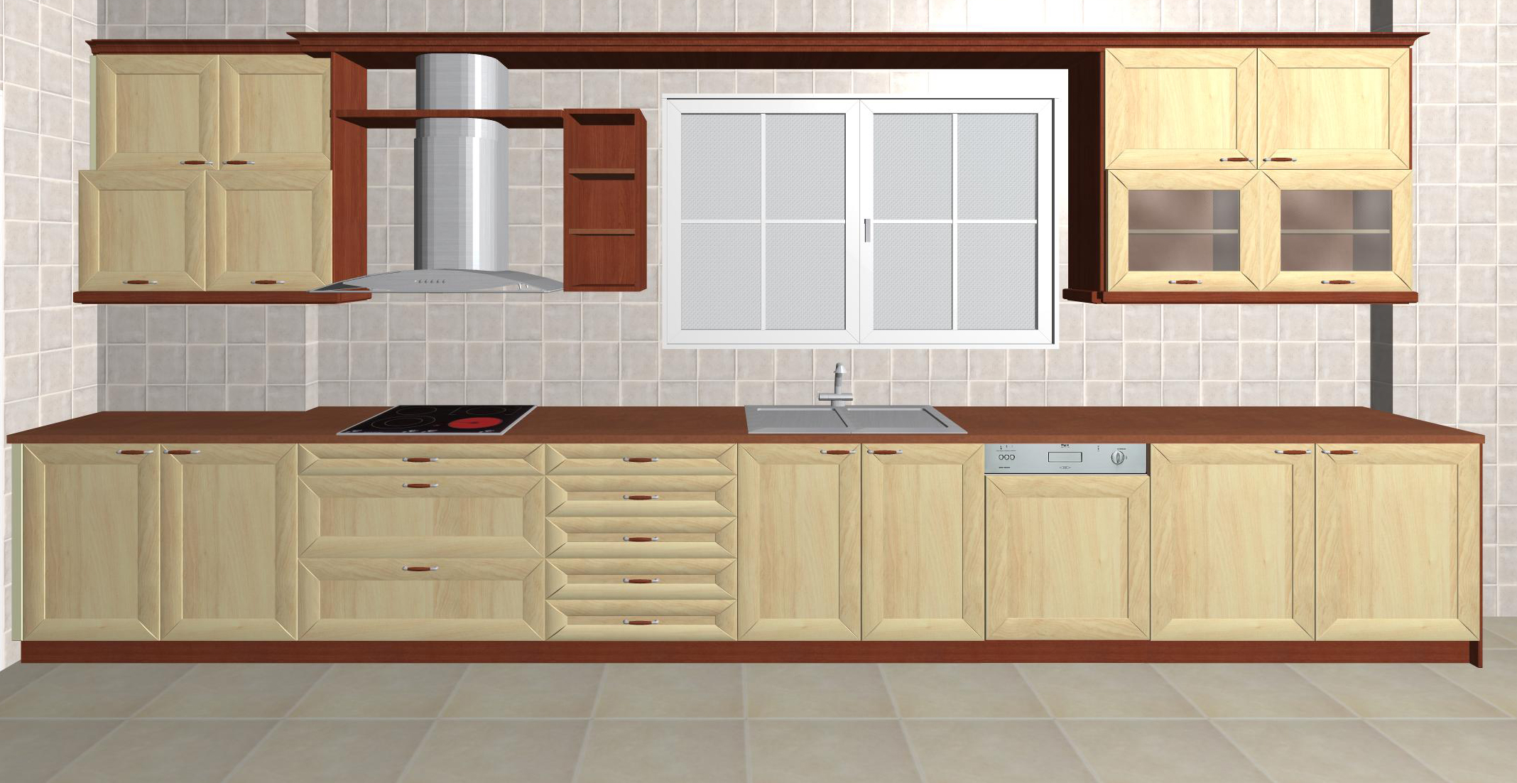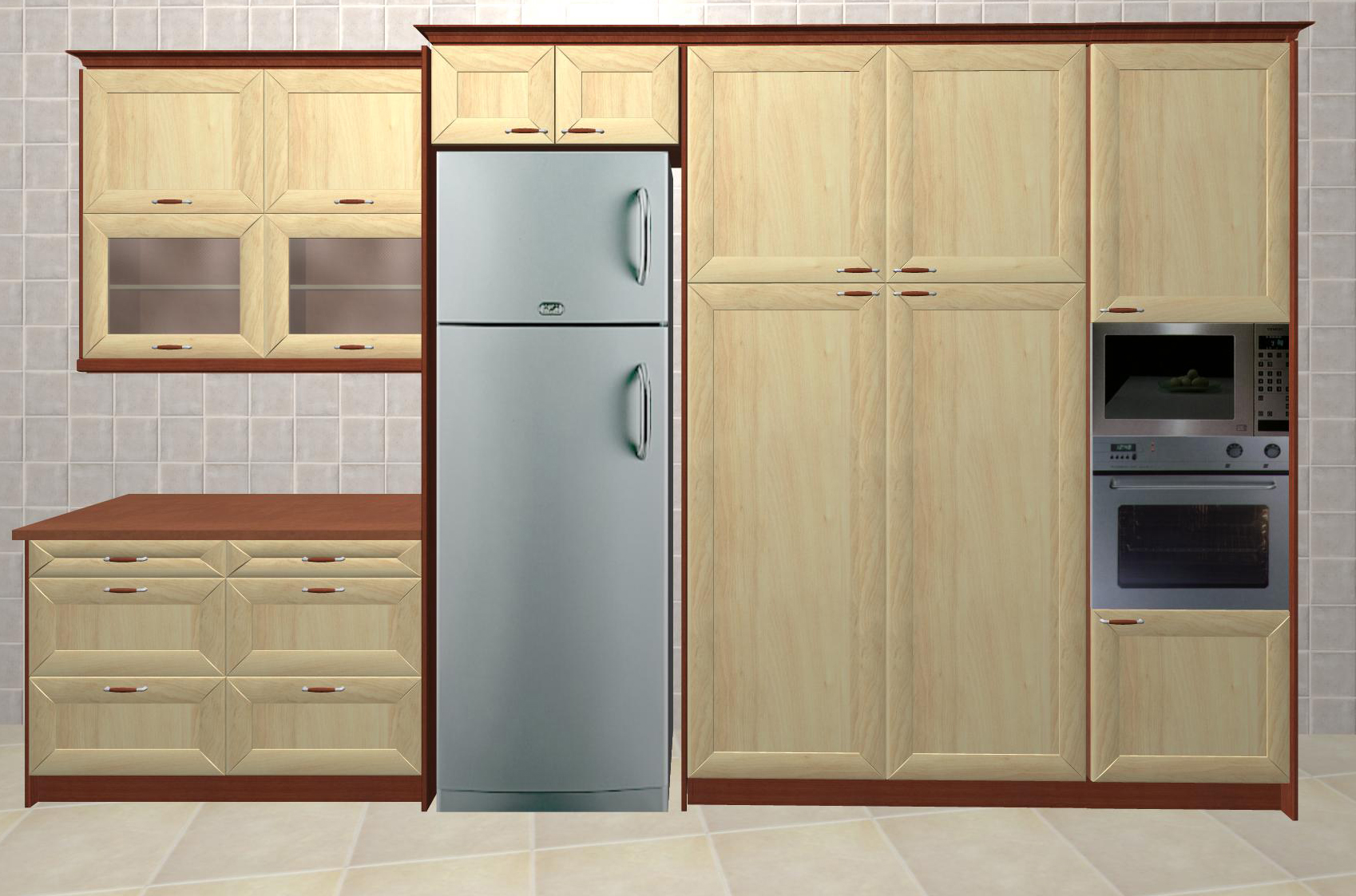 Χαρακτηριστικά: Πόρτες ημιμασίφ σφένδαμος (κελεμπέκι) λουστραρισμένα μέ βερνίκια ακρυλικά βερνίκια έτσι ώστε τό χρώμα των επίπλων να μην αλλοιώνεται ποτέ. Συρτάρια BLUM με μηχανισμό επιβράδυνσης, κασώματα έγχρωμα στο ίδιο χρώμα με τις προσόψεις.Ερμάρια κρεμαστά ύψους 96 εκ.