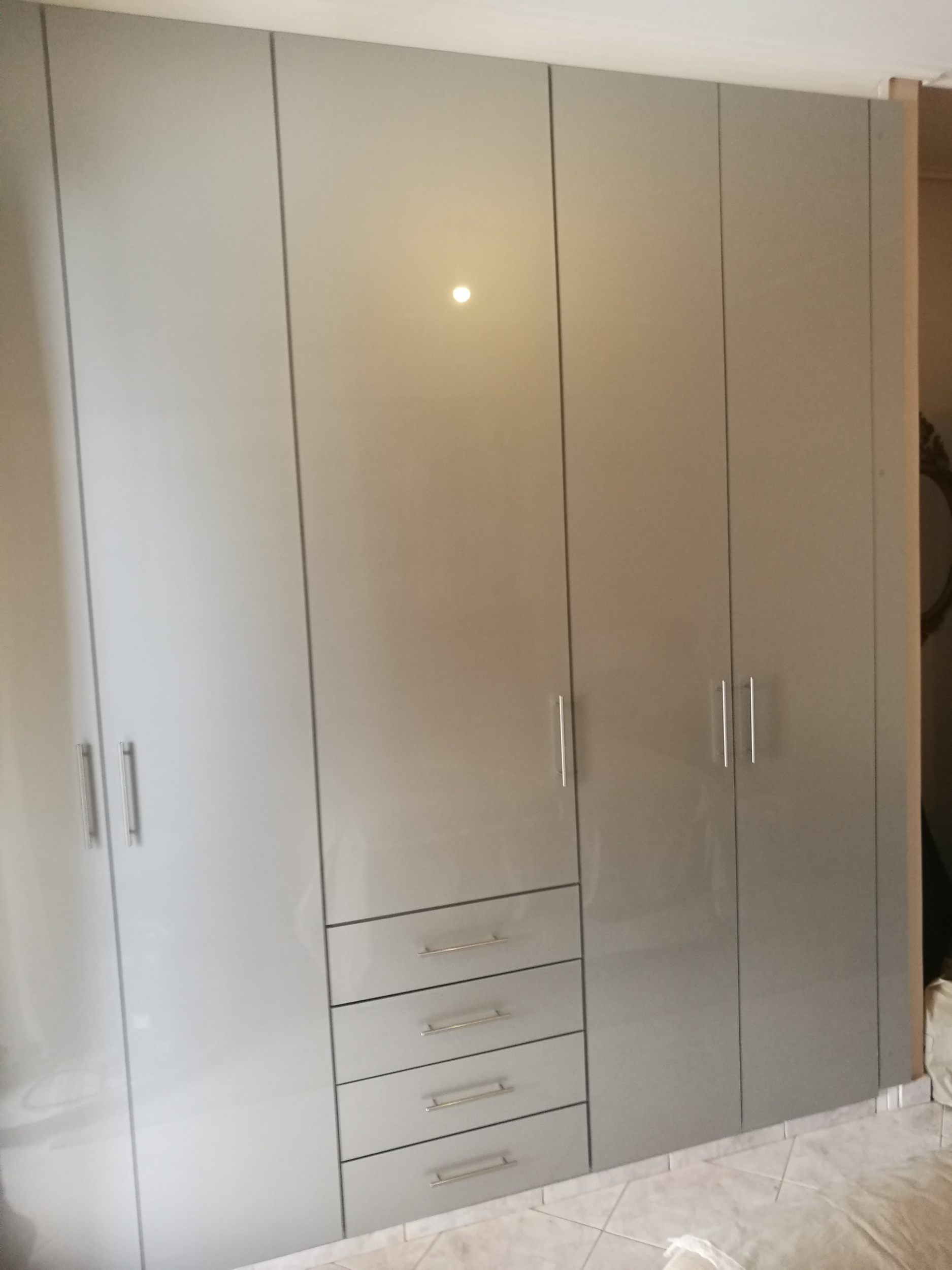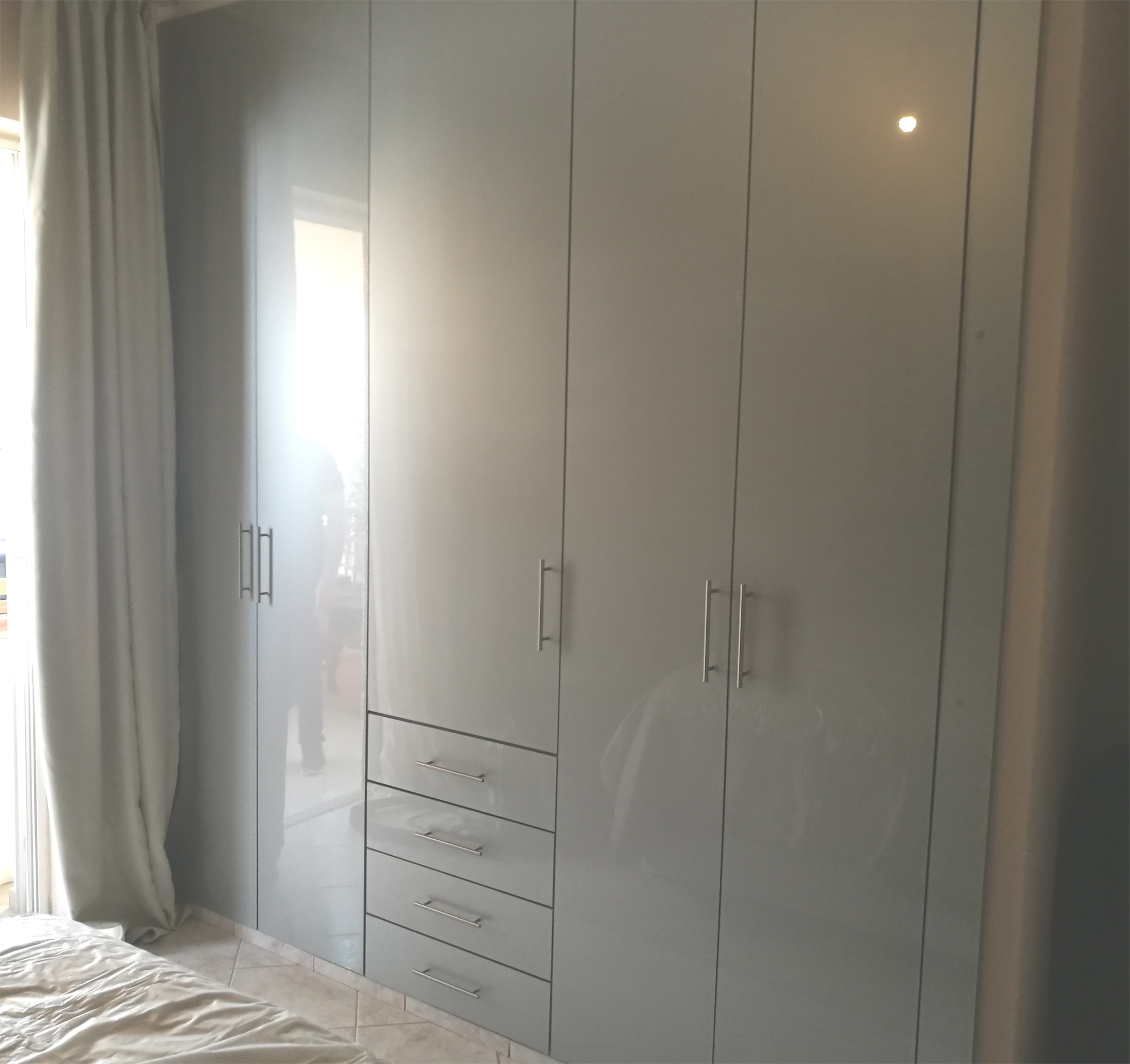 Οι πόρτες είναι PET High Gloss (υψηλής στιλπνότητος) και μελαμίνη 18 χιλ. της Egger η οποία διαθέτει μία πολύ μεγάλη ποικιλία χρωμάτων.Το κύριο χαρακτηριστικό της ντουλάπας είναι οι ενιαίες προσόψεις οι οποίες αυξάνουν σημαντικά την λειτουργικότητα αφού ο χρήστης έχει άμεση πρόσβαση σε όλο το ύψος του χώρου.