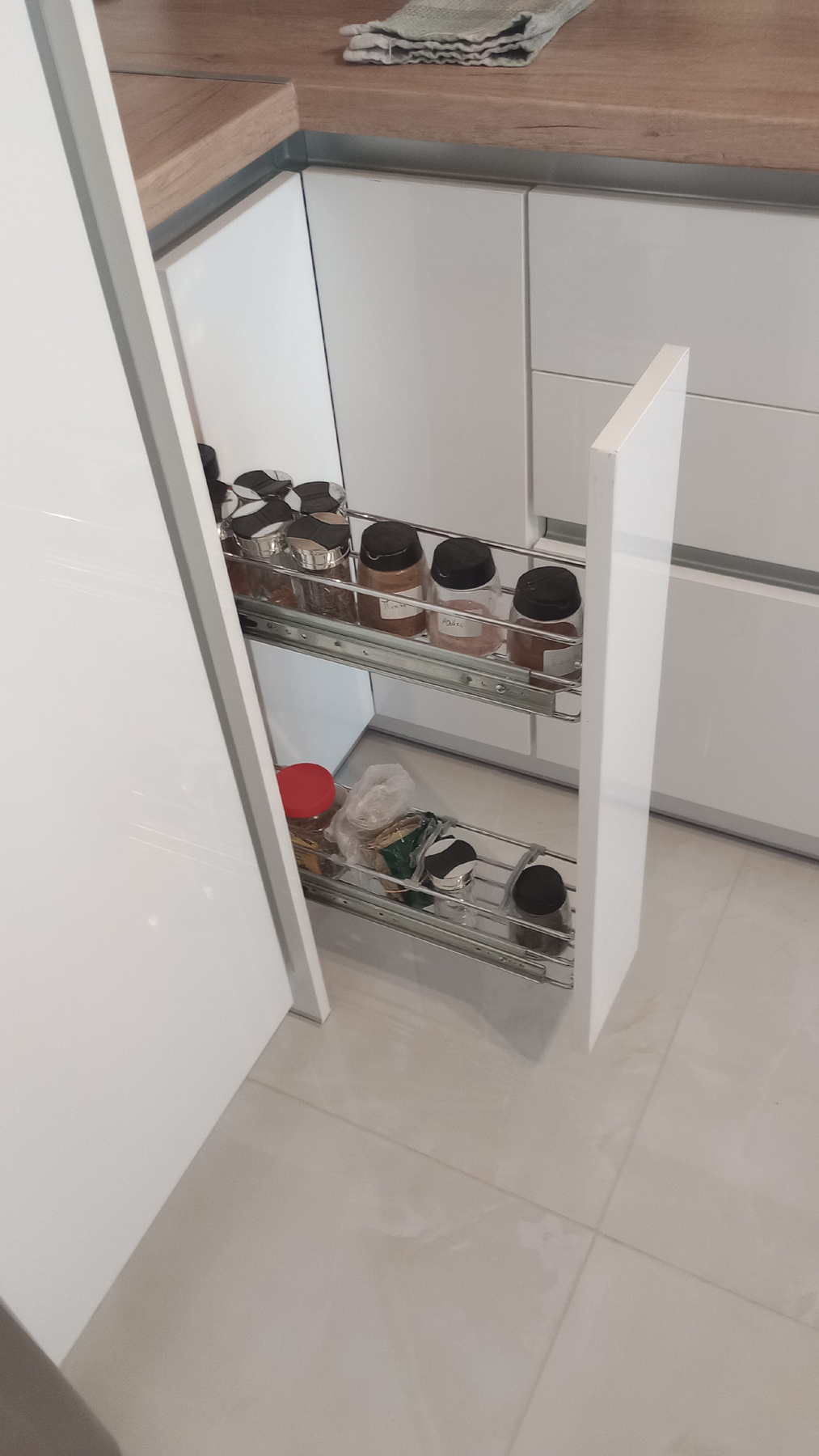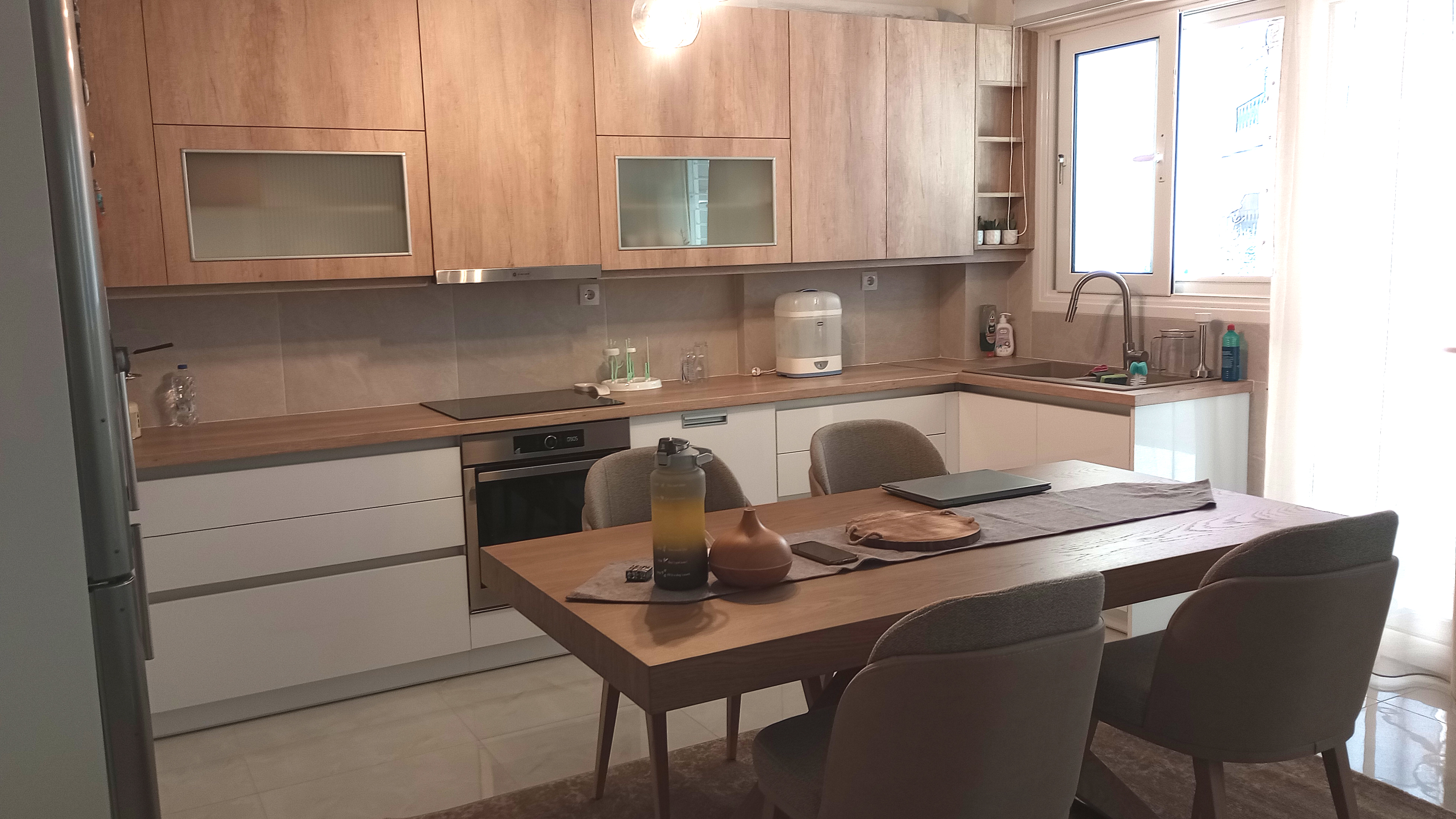Ευρυχωρη κουζίνα μέ άπλετο φώς.Οι προσόψεις στα άνω ερμάρια είναι από μελαμίνη 18 χιλ. επιλεγμένες από μιά πλειάδα χρωμάτων. ενώ στα κάτω είναι Pet λευκό high gloss (υψηλής στιλπνότητος). Η ανυπαρξία πομόλων (σύστημα gola) τονίζει διακριτικά και ευχάριστα την όλη σύνθεση. Κύριο χαρακτηριστικό είναι η αρμονική διχρωμία μεταξύ των άνω και κάτω ερμαρίων.
