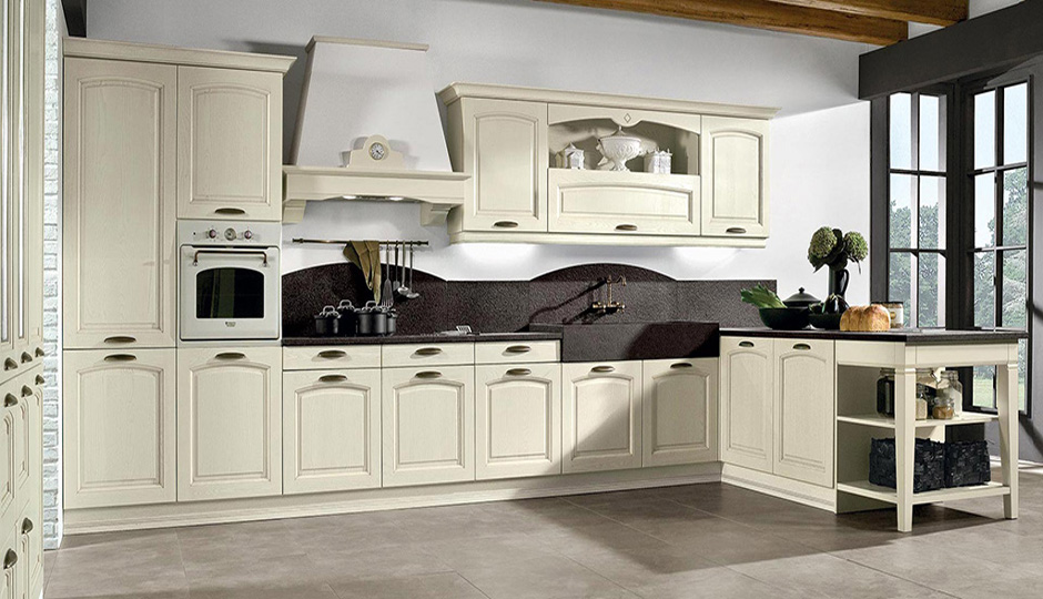 Κλασική κουζίνα που αποπνέει αρχοντιά και σπιτική ζεστασιά. Με προσόψεις από ξύλο Δρυός σε βαφή λάκα ντεκαπέ ανοιχτού χρώματος που παραμένει αναλλοίωτο στον χρόνο (χρησιμοποιούμε ακρυλικές βαφές).Η χρωματική αντίθεση του πάγκου αναδεικνύει την σύνθεση.
