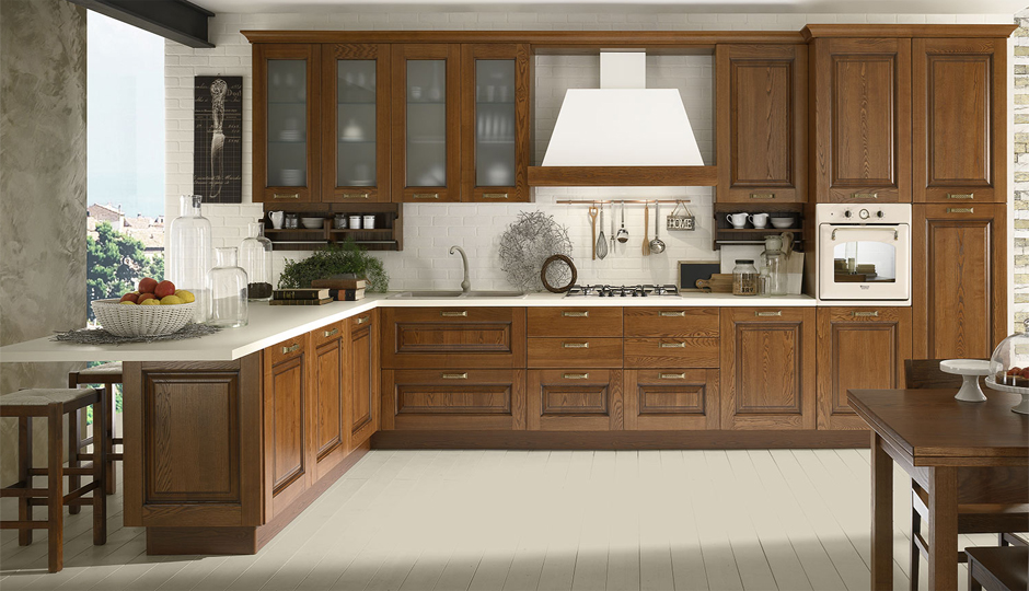Αρχοντική κλασική κουζίνα με προσόψεις από ξύλο Δρυός σε χρώμα κερασιάς. Υψηλά κρεμαστά ερμάρια με βιτρίνες και διακοσμητικές εταζέρες.. Πάσο με προέκταση πάγκου για φαγητό. Κάτωθεν του νεροχύτη υπάρχουν βαγονέτα. Προσέξτε την διπλή σειρά συρταριών κάτω απο τις εστίες Το λευκό χρώμα του πάγκου αναδεικνύει την σύνθεση.