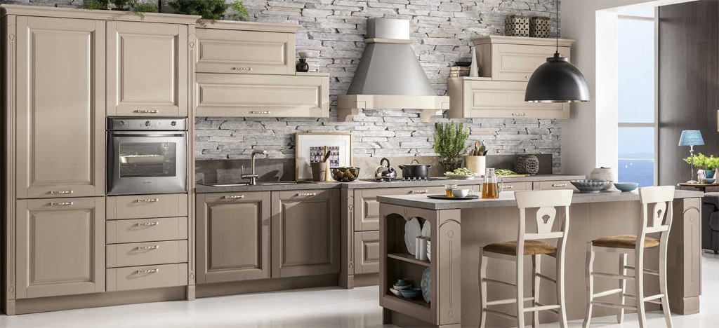 Εξαιρετική νεοκλασική κουζίνα που αποπνέει αρχοντιά και σπιτική ζεστασιά. Με προσόψεις από ξύλο Δρυός σε ανοιχτό χρώμα που παραμένει αναλλοίωτο στον χρόνο (χρησιμοποιούμε ακρυλικές βαφές), πολλά συρτάρια και βαγονέτα, ερμάρια ανακλινόμενα και κεντρική νησίδα ιδιαιτέρου σχεδιασμού και κατασκευής.