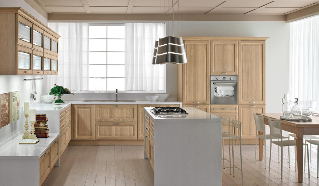 Εξαιρετική κλασική κουζίνα που αποπνέει αρχοντιά και σπιτική ζεστασιά. Με προσόψεις από ξύλο Δρυός σε ανοιχτό χρώμα που παραμένει αναλλοίωτο στον χρόνο (χρησιμοποιούμε ακρυλικές βαφές), πολλά συρτάρια και βαγονέτα, βιτρίνες ανακλινόμενες και κεντρική νησίδα.Το λευκό χρώμα των πάγκων εργασίας φωτίζει την όλη σύνθεση.