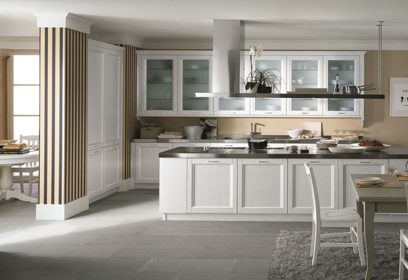 Φωτεινή κλασική κουζίνα που αποπνέει αρχοντιά. Με προσόψεις από ξύλο και καπλαμά (ημιμασίφ) σε βαφή dkp λευκό που παραμένει αναλλοίωτο στον χρόνο (χρησιμοποιούμε ακρυλικές βαφές), και πολλές βιτρίνες.Το σκούρο χρώμα των πάγκων εργασίας αποτελεί αρμονική αντίθεση στην όλη σύνθεση. Οι εστίες έχουν τοποθετηθεί στήν νησίδα η οποία λειτουργεί ως διαχωριστικό από τό καθιστικό.