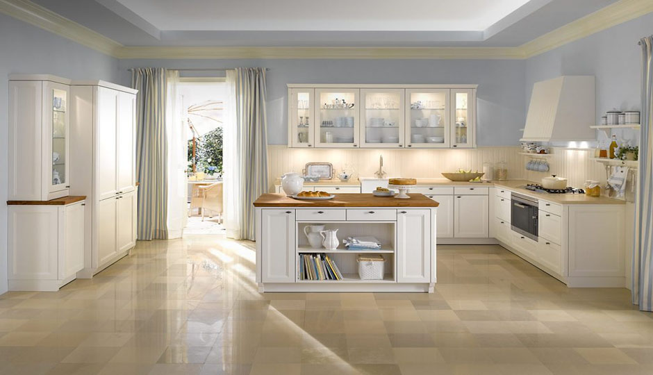 Η κυριαρχία του λευκού και των βιτρινών. Νεοκλασική κουζίνα από mdf σε λάκα λευκή. Με  κεντρική νησίδα. Μιά σχεδιαστική πρόταση για μεγάλους χώρους.