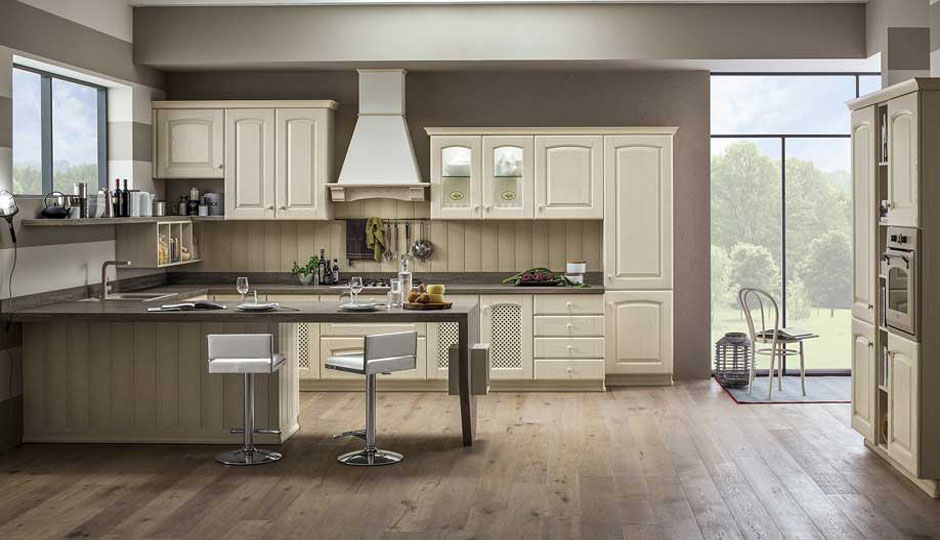 Κλασική κουζίνα που αποπνέει αρχοντιά και σπιτική ζεστασιά. Με προσόψεις από ξύλο Δρυός σε βαφή λάκα ντεκαπέ ανοιχτού χρώματος που παραμένει αναλλοίωτο στον χρόνο (χρησιμοποιούμε ακρυλικές βαφές). Η χρωματική αντίθεση του πάγκου αναδεικνύει την σύνθεση.