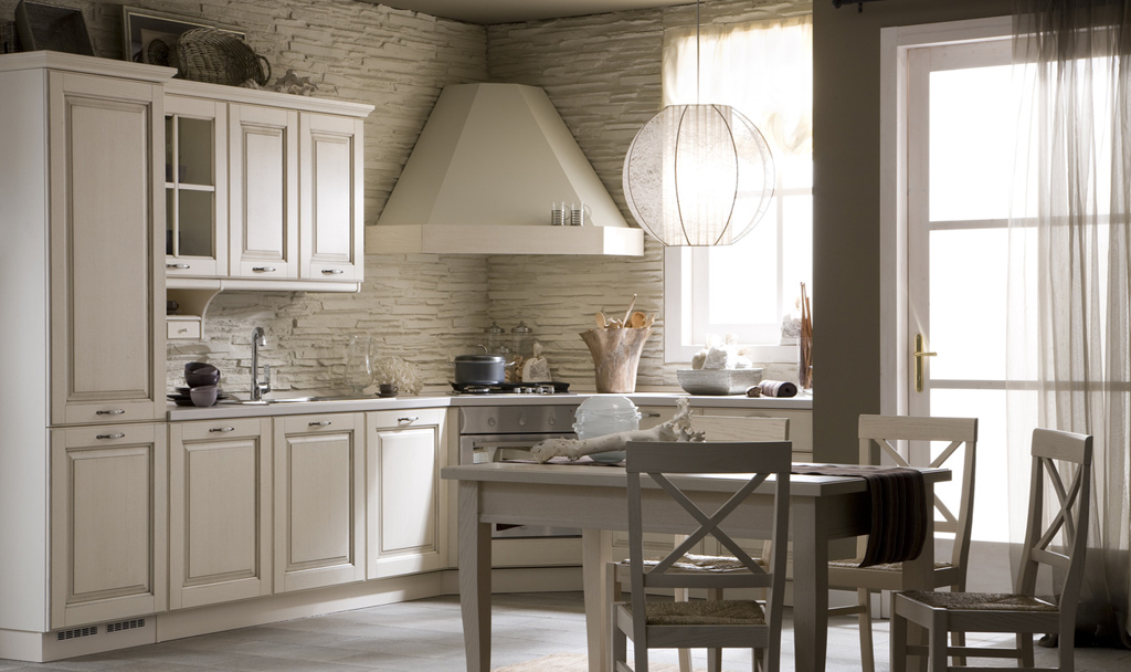 Κλασική κουζίνα που αποπνέει αρχοντιά και σπιτική ζεστασιά. Με προσόψεις από ξύλο Δρυός σε βαφή λάκα ντεκαπέ ανοιχτού χρώματος που παραμένει αναλλοίωτο στον χρόνο (χρησιμοποιούμε ακρυλικές βαφές). Ο φούρνος και οι εστίες είναι τοποθετημένα στην γωνία με την ανάλογη καμινάδα. Διακρίνεται μιά εταζέρα κατω απο τα κρεμαστά ερμάρια.