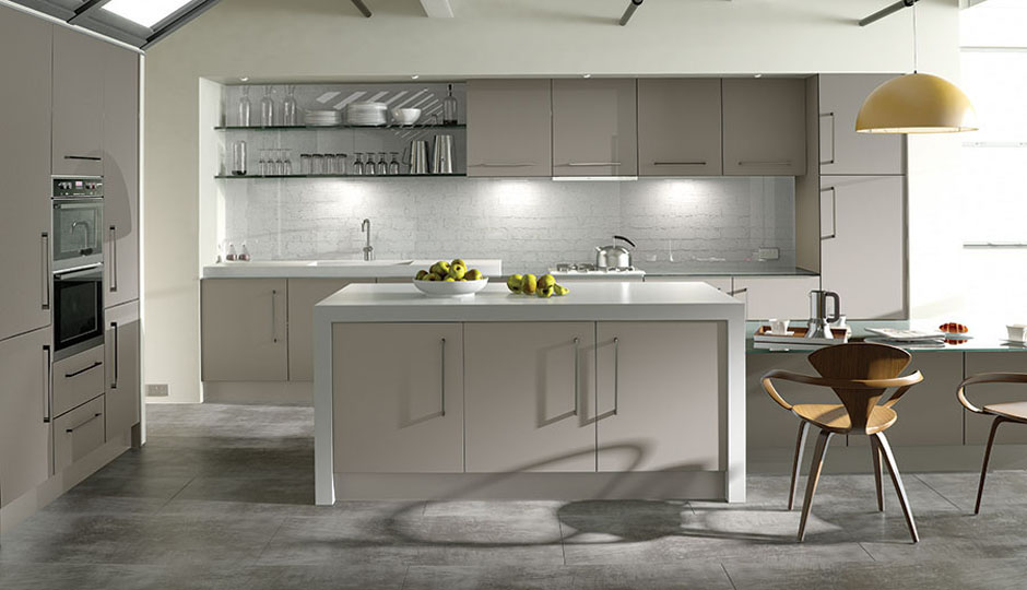 Κουζίνα μοντέρνα με προσόψεις από μελαμίνη 18 χιλ. Εναλλακτική επιλογή (ακριβότερη) προσόψεις MDF λακαριστό σε πλειάδα αποχρώσεων. Χαρακτηριστικά είναι τά μεγάλα ανοιχτά κρυστάλλινα ράφια.