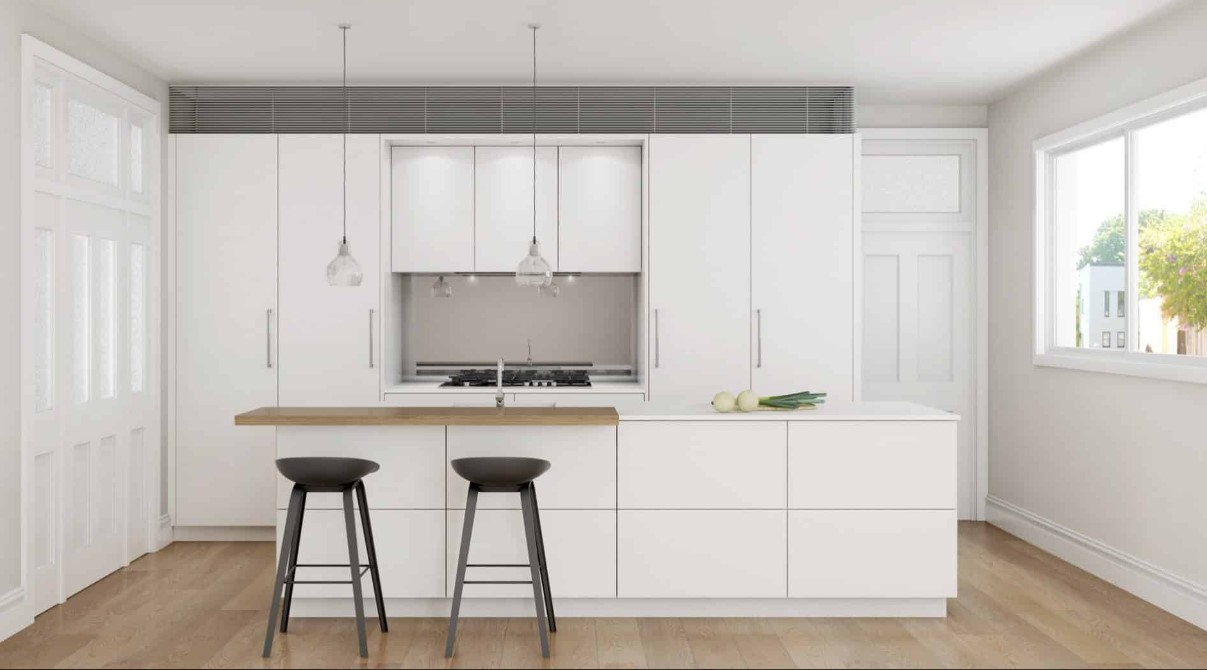 Κουζίνα μοντέρνα με προσόψεις από μελαμίνη Egger 18 χιλ. Εναλλακτική επιλογή (ακριβότερη) pet υψηλής στιλπνότητος (High Gloss). σε πλειάδα αποχρώσεων.Εδώ κυριαρχεί το λευκό χρώμα.Οι μεγάλες ανοξείδωτες λαβές καί τό ξύλινο χρώμα του πάγκου στή νησίδα, αναδεικνύουν την όλη σύνθεση με τρόπο θετικό.Οι πολλές υψηλές μονάδες αυξάνουν σημαντικά τους αποθηκευτικούς χώρους.