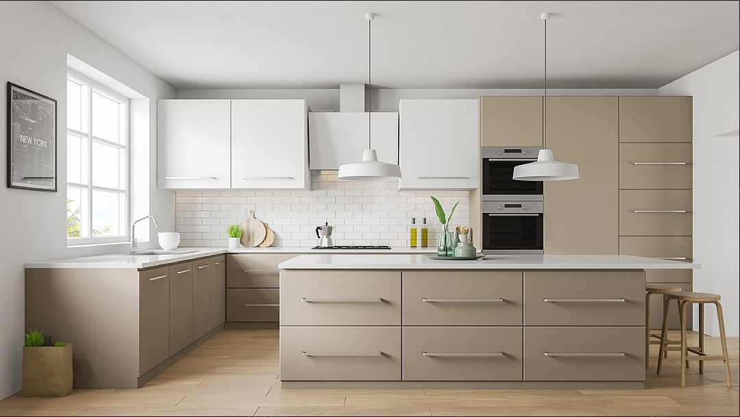 Κουζίνα μοντέρνα με προσόψεις από μελαμίνη Egger 18 χιλ. Εναλλακτική επιλογή (ακριβότερη) pet υψηλής στιλπνότητος (High Gloss). σε πλειάδα αποχρώσεων. Οι μεγάλες ανοξείδωτες λαβές, η διχρωμία καθώς επίσης και ο λευκός πάγκος, αναδεικνύουν την όλη σύνθεση με τρόπο θετικό.
