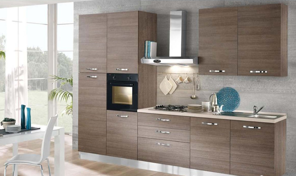 Κουζίνα μοντέρνα, οικονομική, με προσόψεις από μελαμίνη 18 χιλ. Υψηλά ερμάρια για αποθήκευση και βαθειά συρτάρια-σκευοθήκες κάτωθεν των εστιών.