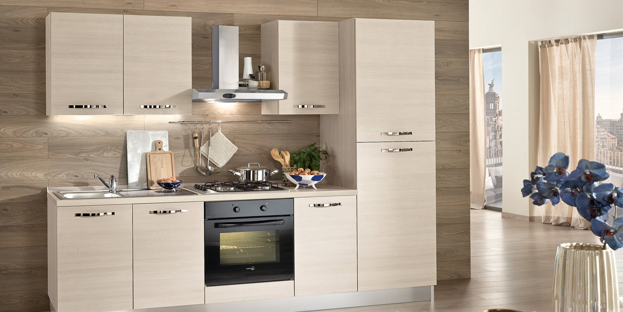 Κουζίνα μοντέρνα οικονομική, με προσόψεις από μελαμίνη 18 χιλ. Μικρή μέν λειτουργική δέ αφού περιέχει όλα τά βασικά: νεροχύτη, φούρνο με εστίες καί μικρό εντοιχιχόμενο ψυγείο.