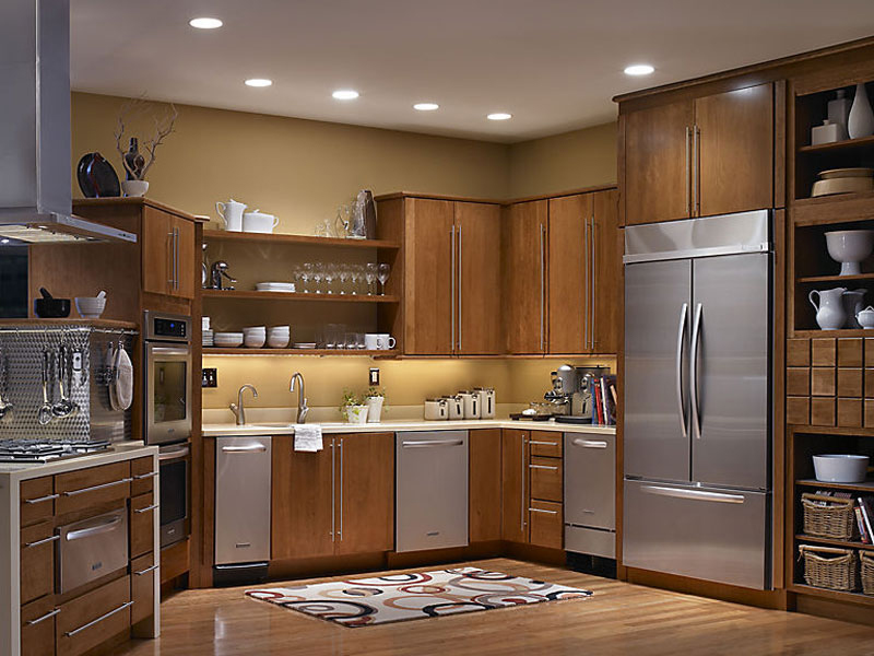 Κουζίνα μοντέρνα με προσόψεις επίπεδες από MDF επενδεδυμένες με καπλαμά σε χρώμα κλασικό. Η χρωματική αντίθεση με τις ανοξείδωτες επιφάνειες των ηλεκτρικών συσκευών και τις μεγάλες λαβές όπως επίσης και τα διαφορετικά ύψη των κρεμαστών ερμαρίων, αναδεικνύουν την κουζίνα με πολύ θετικό τρόπο.