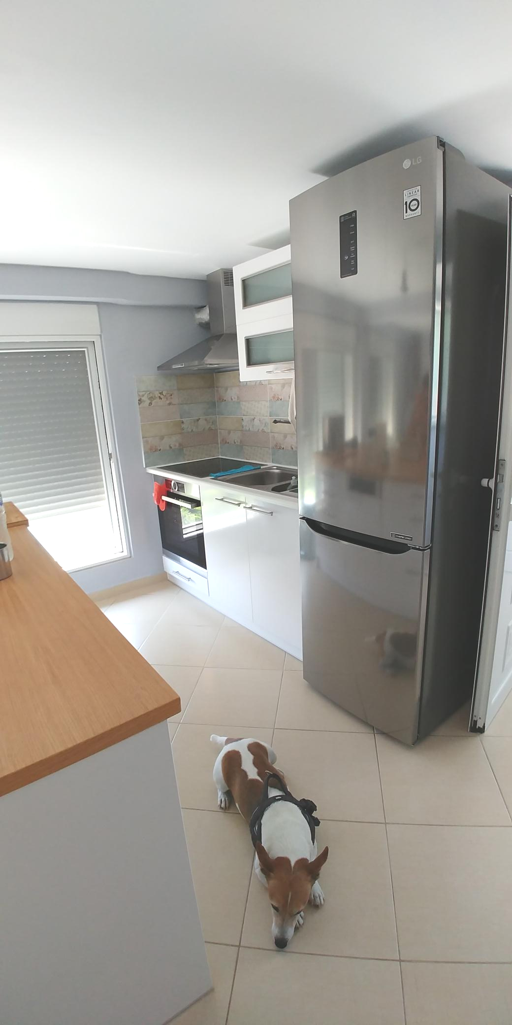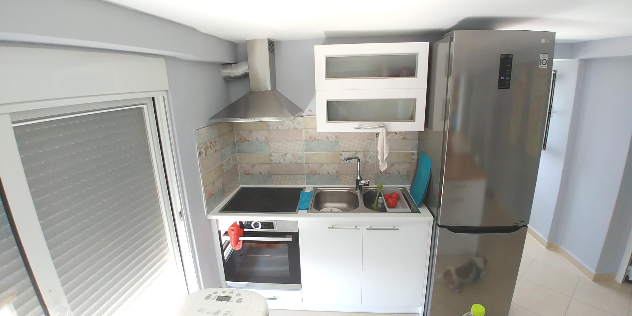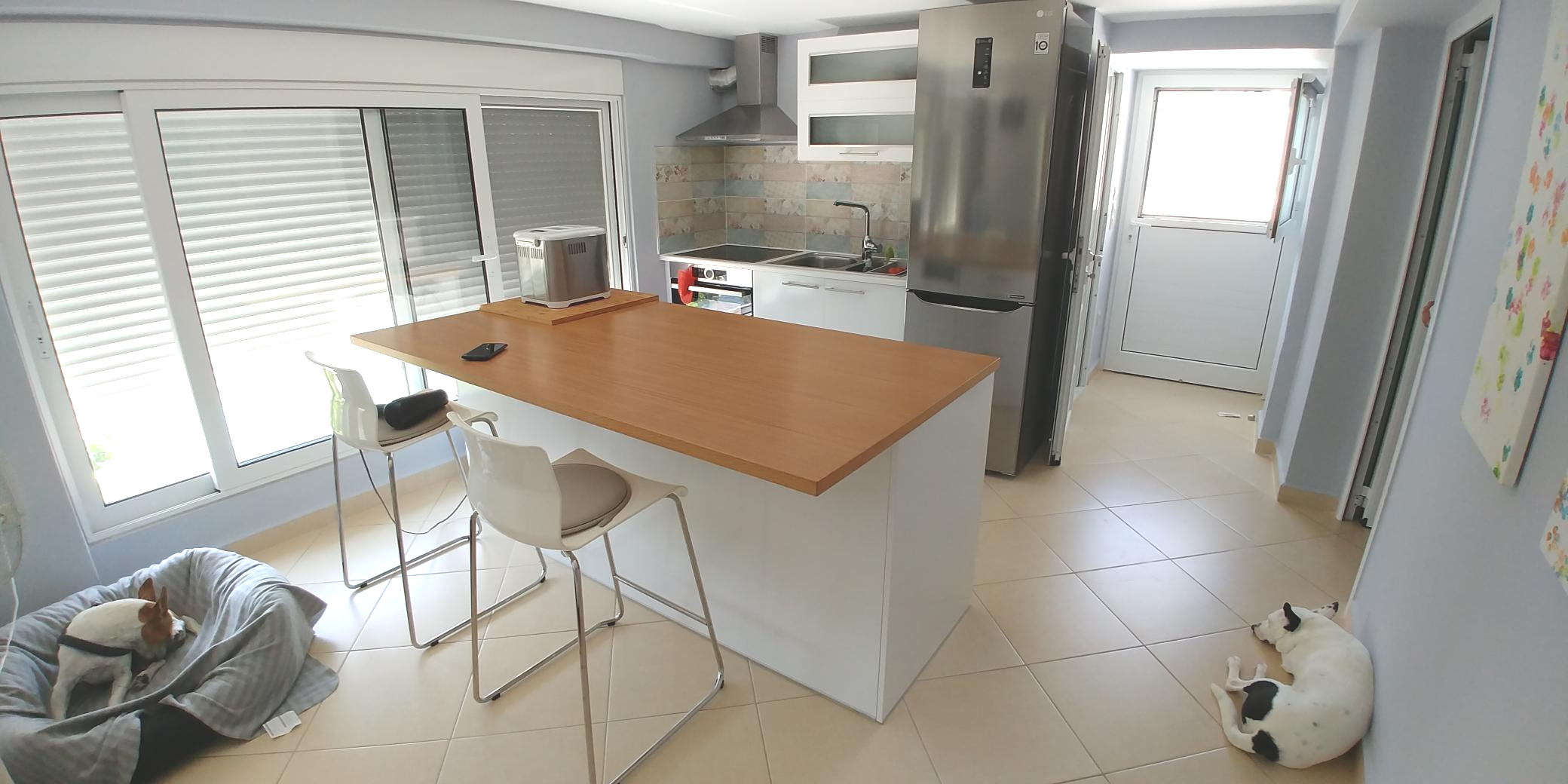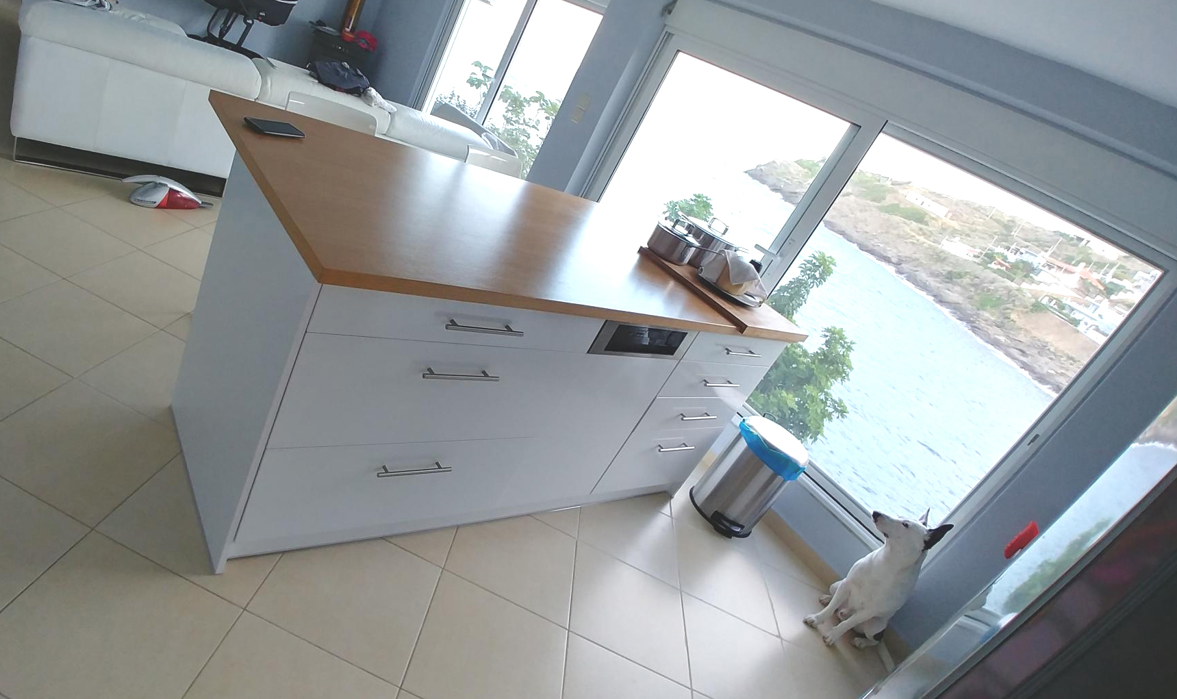 Κουζίνα μοντέρνα με υλικό πρόσοψης μελαμίνη 18 χιλ. γυαλιστερή (High Gloss) λευκή. Στο κέντρο υπάρχει νησίδα με πάγκο μεγαλύτερο που χρησιμοποιείται και ως τραπέζι φαγητού.Το υλικό και το χρώμα του πάγκου (επενδεδυμένη Δρυς σε χρώμα φυσικό με ακρυλική βαφή που παραμένει αναλοίωτη στον χρόνο) αποτελεί μία αρμονική αντίθεση στο λευκό σύνολο.Συρτάρια μεγάλα με μηχανισμό επιβράδυνσης και άνωθεν του νεροχύτη ερμάριο με ανακλινόμενο μηχανισμό Blum.