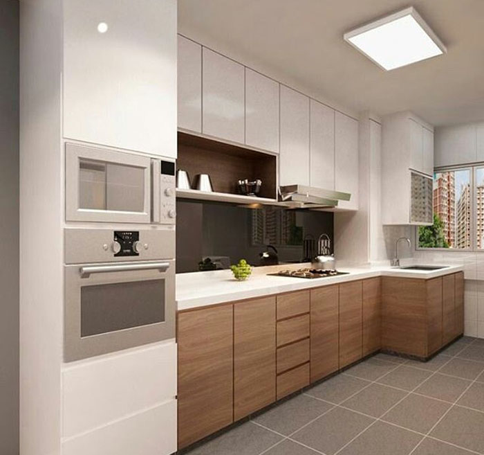 Κουζίνα μοντέρνα με προσόψεις από μελαμίνη 18 χιλ. σε αρμονικό συνδυασμό του λευκού στα άνω ερμάρια με απόχρωση ξύλου στα κάτω ερμάρια.