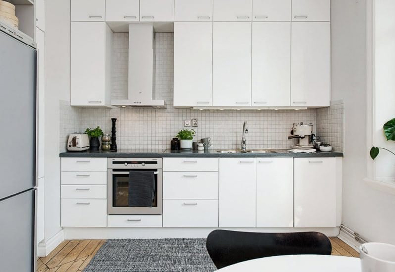 Κουζίνα μοντέρνα σε λιτό σχεδιασμό με προσόψεις από μελαμίνη 18 χιλ. λευκή σε αρμονικό συνδυασμό με πάγκο σε μαύρο χρώμα. Διπλή σειρά κρεμαστών ερμαρίων για πλήρη αξιοποίηση του χώρου.Έπιπλα κουζίνας με την εγγύηση και την αξιοπιστία Sylko-Λιάκος.