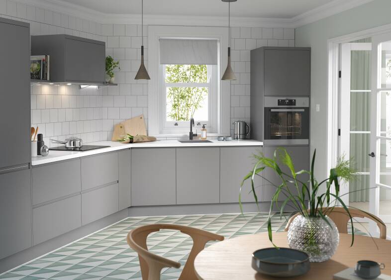 Κουζίνα μοντέρνα, σε διάταξη αμβλείας γωνίας, με προσόψεις από μελαμίνη Egger 18 χιλ. Εναλλακτική επιλογή (ακριβότερη) pet υψηλής στιλπνότητος (High Gloss) η μάτ σε πλειάδα αποχρώσεων. Η ανυπαρξία πομόλων με το σύστημα Gola, το απαλό γκρί χρώμα καθώς επίσης και ο λευκός πάγκος, αναδεικνύουν την όλη σύνθεση με τρόπο θετικό.