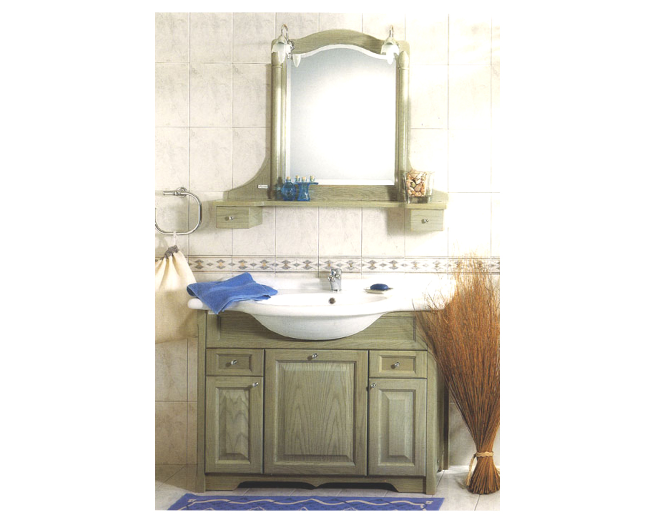 Υλικά κατασκευής: Προσόψεις ημιμασίφ Δρύς. Κάσωμα mdf επενδεδυμένο με καπλαμά δρυός.Ακραίες κολώνες και καθρέπτης ιδιαιτέρου σχεδιασμού από ατόφιο ξύλο Δρυός. Μεγάλη ποικιλία χρωμάτων